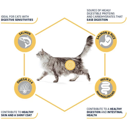 Affinity Advance Adult Salmon Sensitive ist ein leckeres Futter für ausgewachsene Katzen. Aufgrund der Zusammensetzung mit Lachs und Reis ist es auch für Tiere mit einer Futtermittelüberempfindlichkeit geeignet. Außerdem unterstützt es die Darmflora, so dass es auch an Katzen mit einem empfindlichen Verdauungssystem gegeben werden kann.