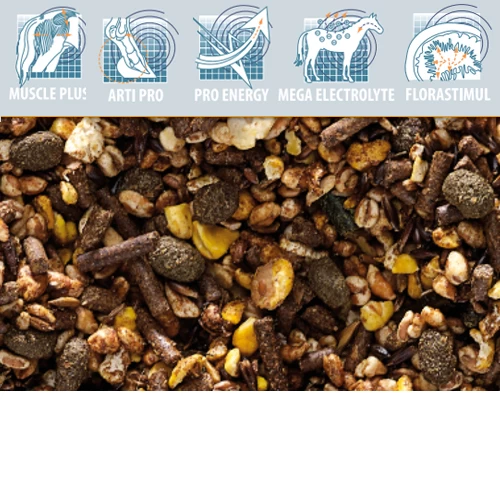 Hafer, Weizenkleie, Gerste und Weizen (aufgepufft), Leinsamen-Spelzen, Mais (gepufft), Zuckerrohrmelasse, Maiskleie, Sonnenblumenschrot, Sojaöl, Leinsamen, Luzerne, Palmkernkuchen, Ackerbohnen-Flocken, Mais, Gerste, Weizenkleberfutter, Sojabohnen (getoastet), Natriumchlorid, Weizen, Kalziumkarbonat, Bierhefe, Ölsaatensamen (Bruchstücke), Sojabohnenschalen (aus genetisch veränderten Sojabohnen), Dinkelkleie, Oligofructose, Palmöl.