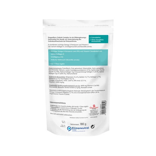 Benötigt Ihr Hund Unterstützung für seine Gelenke? Doppelherz Gelenk Complex für Hunde ist ein innovatives und wirksames Diätergänzungsfuttermittel. Es kombiniert wertvolle, natürliche Inhaltsstoffe zur Unterstützung des Gelenkstoffwechsels bei Osteoarthrose. Mit nativem Kollagen Typ II, Grünlippmuschelpulver und Indischem Weihrauch (Boswellia serrata), kombiniert mit Vitamin E. Die Verabreichung ist einfach, da nur ein leckerer Kausnack pro Tag genügt.