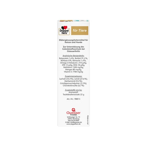 Doppelherz Gelenk Öl Omega-3 für Katzen und Hunde ist ein reichhaltiges, gut schmeckendes und hochwertiges Öl zur Futterergänzung für Katzen und Hunden. Es enthält essentielle Omega-3 Fettsäuren zur Unterstützung des Gelenkstoffwechsels bei Osteoarthrose von Katzen und Hunden. Mit natürlichem Grünlippmuschelpulver, Teufelskralle, Chondroitin, Vitamin E und Mangan.