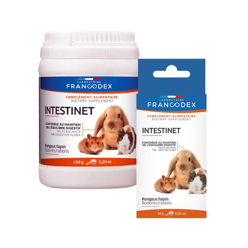 Zur Ergänzung der täglichen Ernährung Ihres Kaninchens oder Nagetiers hat Francodex das Nahrungsergänzungsmittel Intestinet entwickelt. Das Präparat enthält Beta-Glucane und Mannan-Oligosaccharide, die die Darmflora und den Darmtrakt Ihres Haustieres unterstützen. Intestinet ist sehr gut geeignet für Haustiere, die ein anderes Futter fressen müssen oder sich im Heilungsprozess befinden.