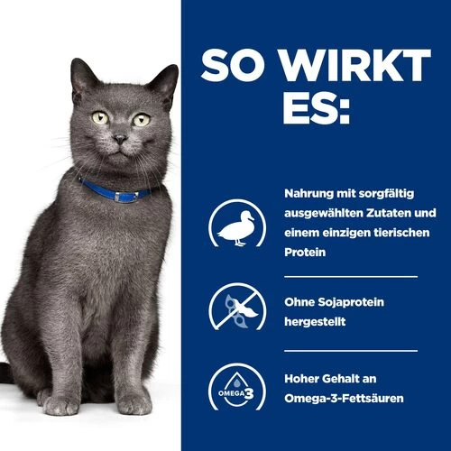 Hill’s d/d Allergy / Skin Care ist Trocken- und Nassfutter für Katzen mit einer Nahrungsmittelallergie oder -intoleranz; mit Ente und grünen Erbsen.