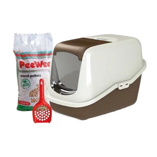 PeeWee EcoHus ist eine robuste, geschlossene Katzentoilette mit geruchsdezimierendem Aktivkohlefilter für mittelgroße Katzen. Die Katzentoilette besteht aus zwei Wannen, wobei fast aller Urin in der Auffangwanne landet, sodass die Streu und die Katzenpfoten sauber bleiben.